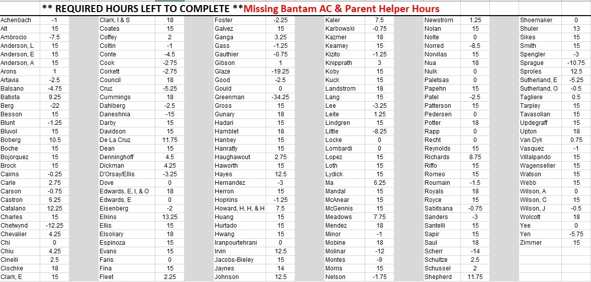The lists below show the balance of hours left to fulfill the 15/18 hr. regular season requirement and explains the requirement of volunteering at the finals meets. If you are a parent helper at the practices or meets and your hours aren't reflected here, check with your coach and have them contact me.